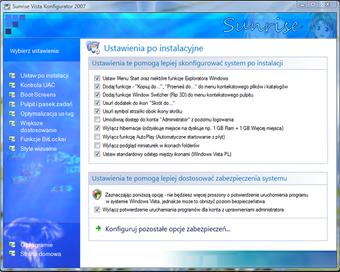 Sunrise Vista Konfigurator to program pozwalający na modyfikację ustawień systemu Windows Vista. Dzięki Sunrise Vista Konfigurator można łatwo dostosować swoją Vistę do własnych potrzeb. Opisywana tu wersja przeznaczona jest dla systemu Windows Vista 64-bit.