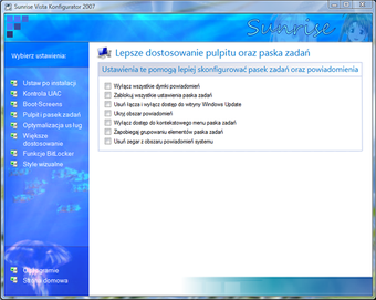 Sunrise Vista Konfigurator pozwala na zmianę ekranu rozruchowego, dostosowanie zachowania interfejsu Windows Vista oraz optymalizację usług systemowych. Wśród wielu ciekawych opcji znajdziemy możliwość wyłączenia hibernacji i dymków powiadomień oraz dodania do menu kontekstowego własnych opcji uruchamiania plików. Zmiana niektórych ustawień może ograniczyć funkcjonalność Twojego systemu, dlatego zalecamy ostrożność przy używaniu tego programu.